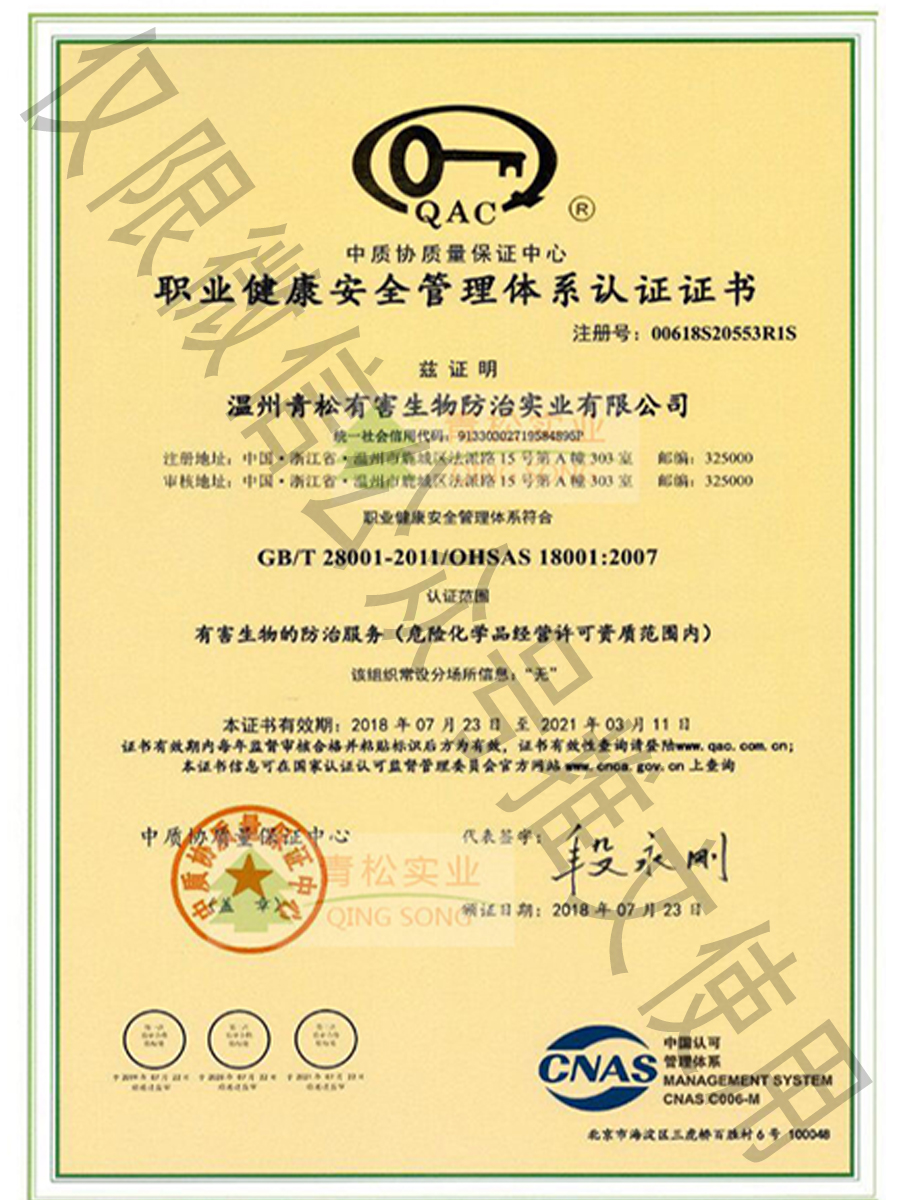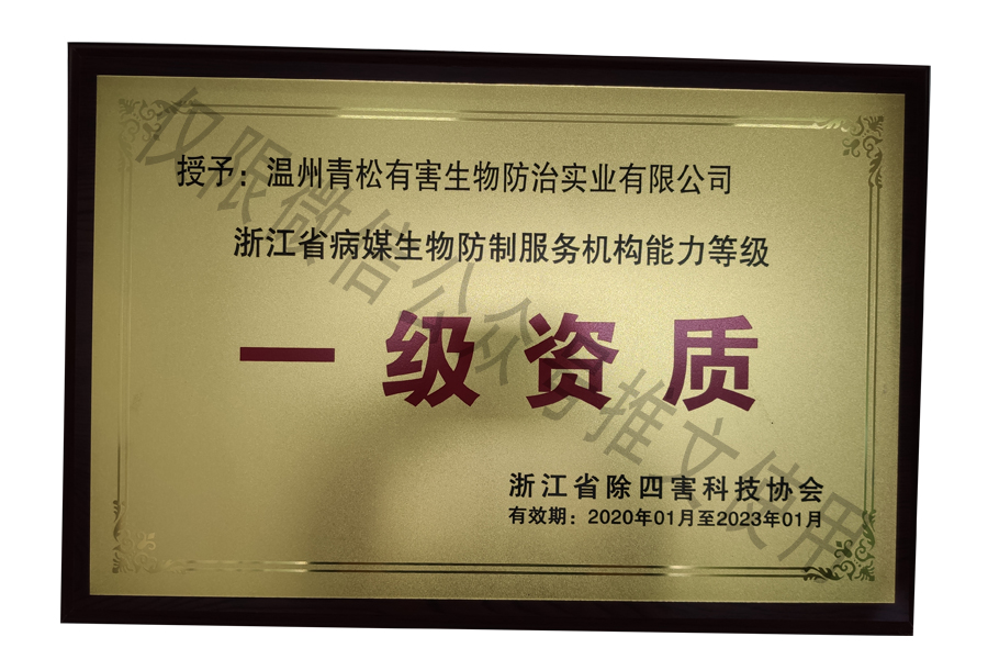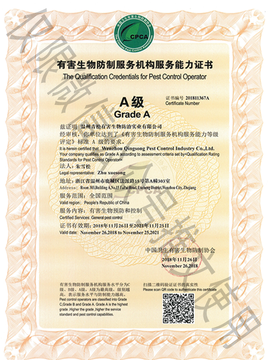 國家級有害生物防制認(rèn)證機構(gòu)A級證書/浙江省病媒生物防制服務(wù)機構(gòu)能力等級一級資質(zhì)