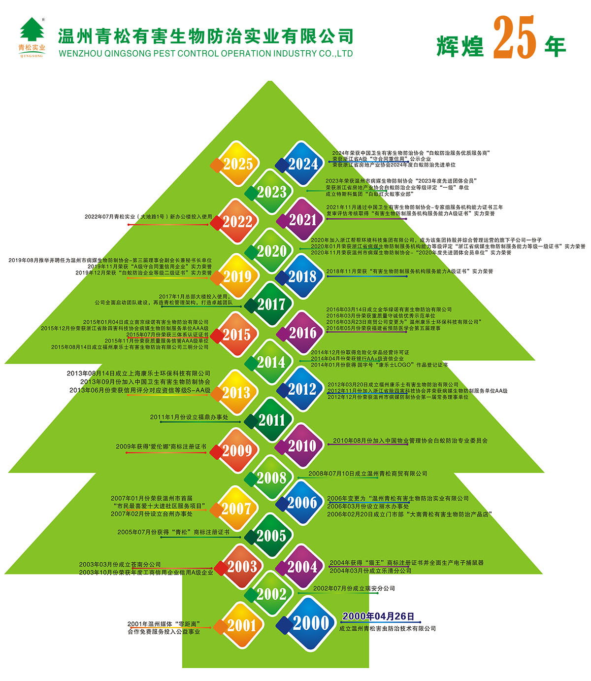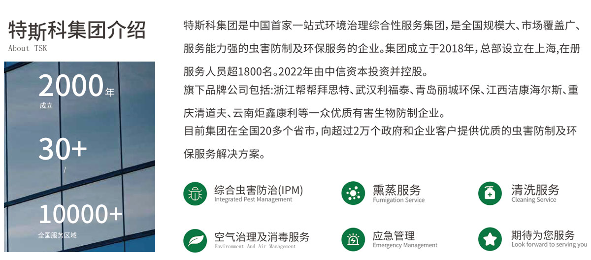 公司成立20年,立足于溫州地區(qū)及周邊城市,現(xiàn)公司在瑞安、蒼南、樂清、麗水、臺州、福鼎、福州、上海、南京、福州三明、金華等11處設分公司和辦事處,對各地區(qū)蟲害防制、城市創(chuàng)建服務做出長遠的貢獻。