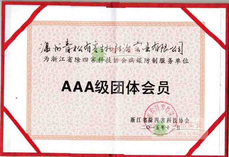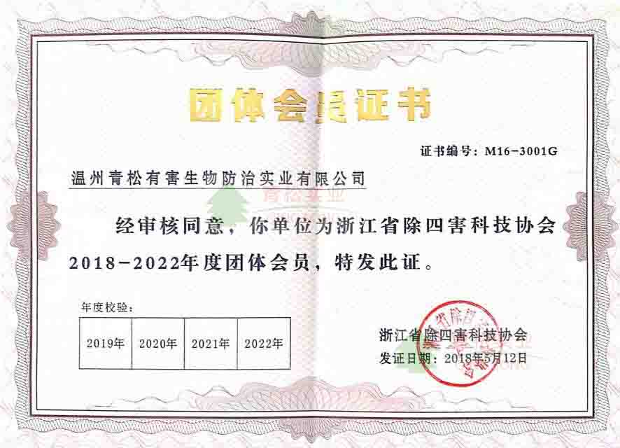 中國(guó)衛(wèi)生有害生物防治協(xié)會(huì)團(tuán)體會(huì)員證證書