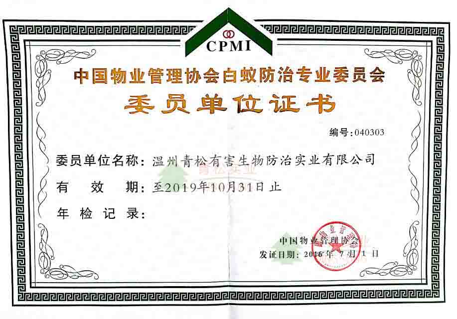 中國(guó)物業(yè)管理協(xié)會(huì)白蟻防治專業(yè)委員會(huì)委員單位證書